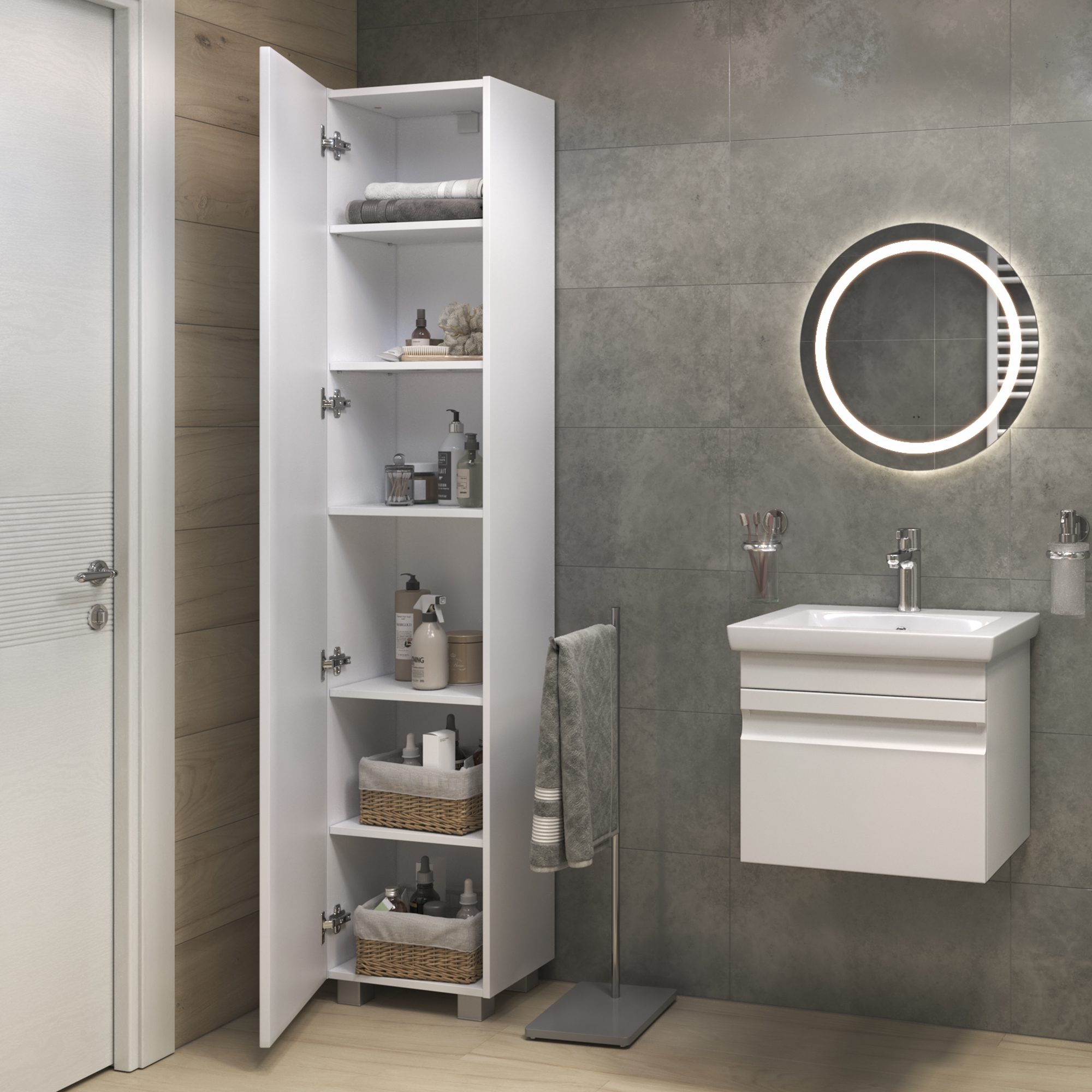 Шкаф-пенал VIGO Holly 400 мм белый (pn.HOL.40). Комплектация: корпус шкафа, 1 дверца, 4 полки ЛДСП, петли с механизмом доводчика, 4 опоры квадратные регулируемые