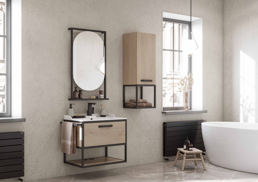 Открытая навесная полка в цвете Дуб Кантри выполнена в форме куба и может использоваться как самостоятельный элемент декора и хранения, а также как дополнение к шкафчику из коллекции Лофт Фабрик. Полка выполнена из черного металлического профиля и влагостойкой ламинированной плиты. Она идеально подойдет для того, чтобы расставить в ванной комнате четкие акценты в дизайне и обеспечить дополнительное место для хранения.