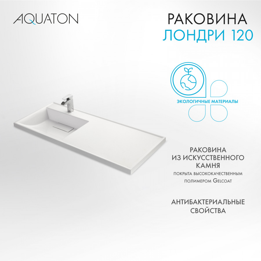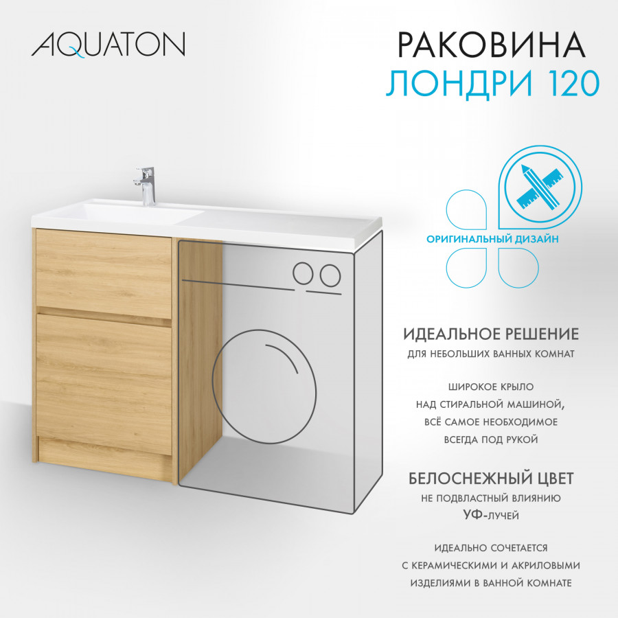 Раковина из литьевого мрамора, прямоугольной формы, ориентация левосторонняя, монтаж над стиральной машиной, отверстия под смеситель и перелив отсутствуют.