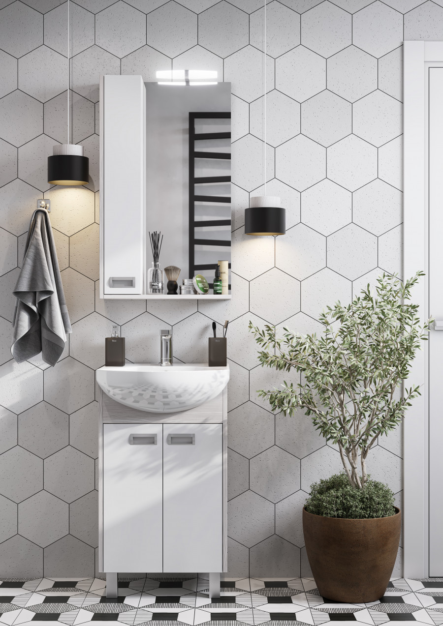Шкаф- 1 шт., полка - 2, светильник - 1, фасад створка - 1 шт, петли с интегрированной системой плавного закрывания - 2, ручка - 1. Светильник может отличаться в зависимости от партии.