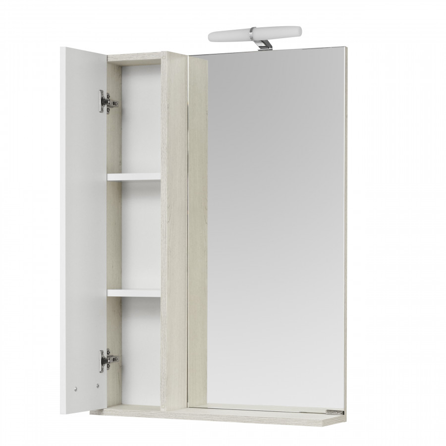 Шкаф- 1 шт., полка - 2, светильник - 1, фасад створка - 1 шт, петли с интегрированной системой плавного закрывания - 2, ручка - 1. Светильник может отличаться в зависимости от партии.