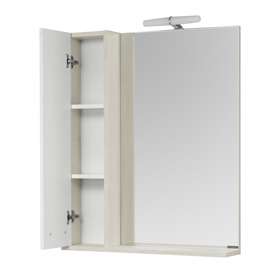 Шкаф- 1 шт., полка - 2, светильник - 1, фасад створка - 1 шт, петли с интегрированной системой плавного закрывания - 2, ручка - 1. Светильник может отличаться в зависимости от партии.