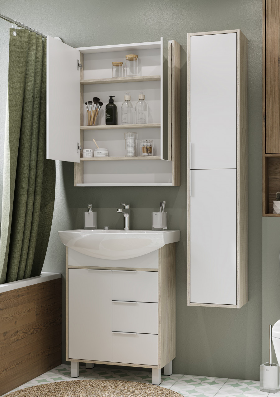 Для ванных комнат, которые не обладают внушительными габаритами, стильным и практичным решением станет компактный зеркальный шкаф Рико 65 от AQUATON в комбинированной отделке. Корпус, в котором сочетаются белый цвет и элегантная текстура под дерево "ясень фабрик", а также распашные фасады с зеркальным покрытием изготовлены из влагостойкой ЛДСП. Шкаф достаточно вместительный и оснащён двумя внутренними полками. Петли с доводчиком обеспечивают плавное закрывание фасадов-створок. Отсутствие ручек и открытая нижняя полка подчеркивают простой и лаконичный дизайн данной модели.