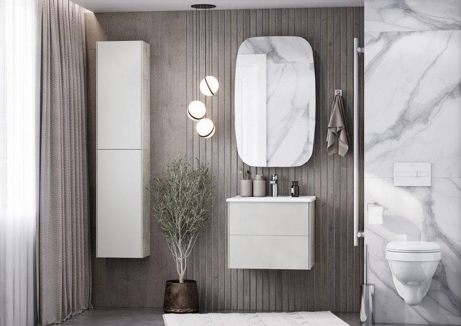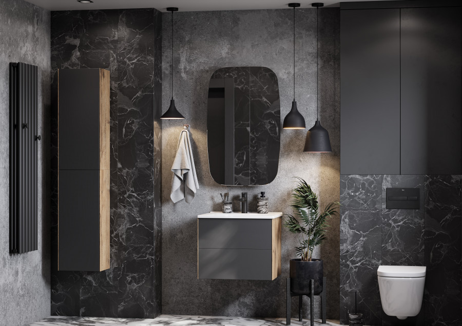 Сохо зеркало необычной овальной формы, скругленные углы добавляют индивидуальности изделию и безопасны в эксплуатации. Корпус и фасад выполнены также в цветовой гамме антрацит. Фасад оснащен петлями с доводчиком. За фасадом с зеркальным полотном расположена ассиметричная конструкция полочек, позволяющая хранить косметические средства различной высоты и объема. Перегородки из ЛВДСП антрацит сочетаются со стеклянными полочками цвета графит. Глубина шкафчика 112мм, высота 720мм, ширина - 500мм.