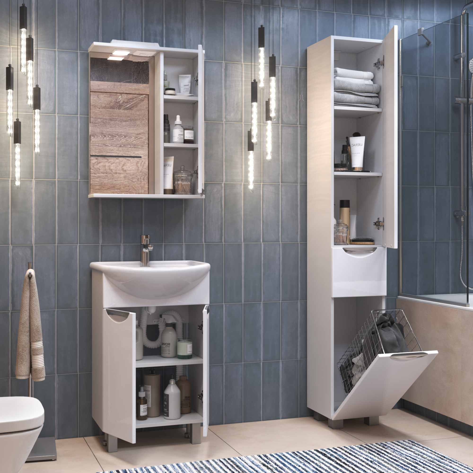 Левое/правое исполнение шкафчика; 2 полки ЛДСП; ручка металлическая хромированная; 1 светодиодный светильник, включатель с розеткой.