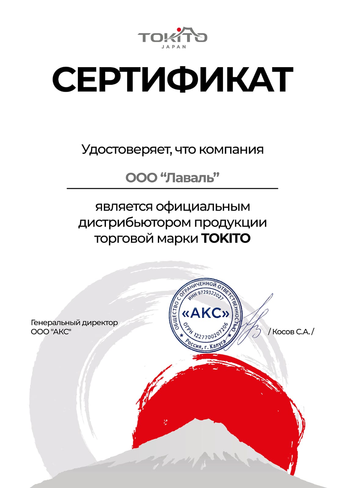 TOKITO Сертификат дистрибьютора ООО ЛАВАЛЬ