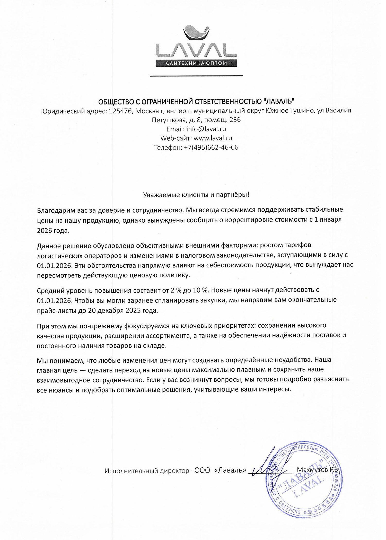 Корректировка цен ЛАВАЛЬ с 1 января 2026 года