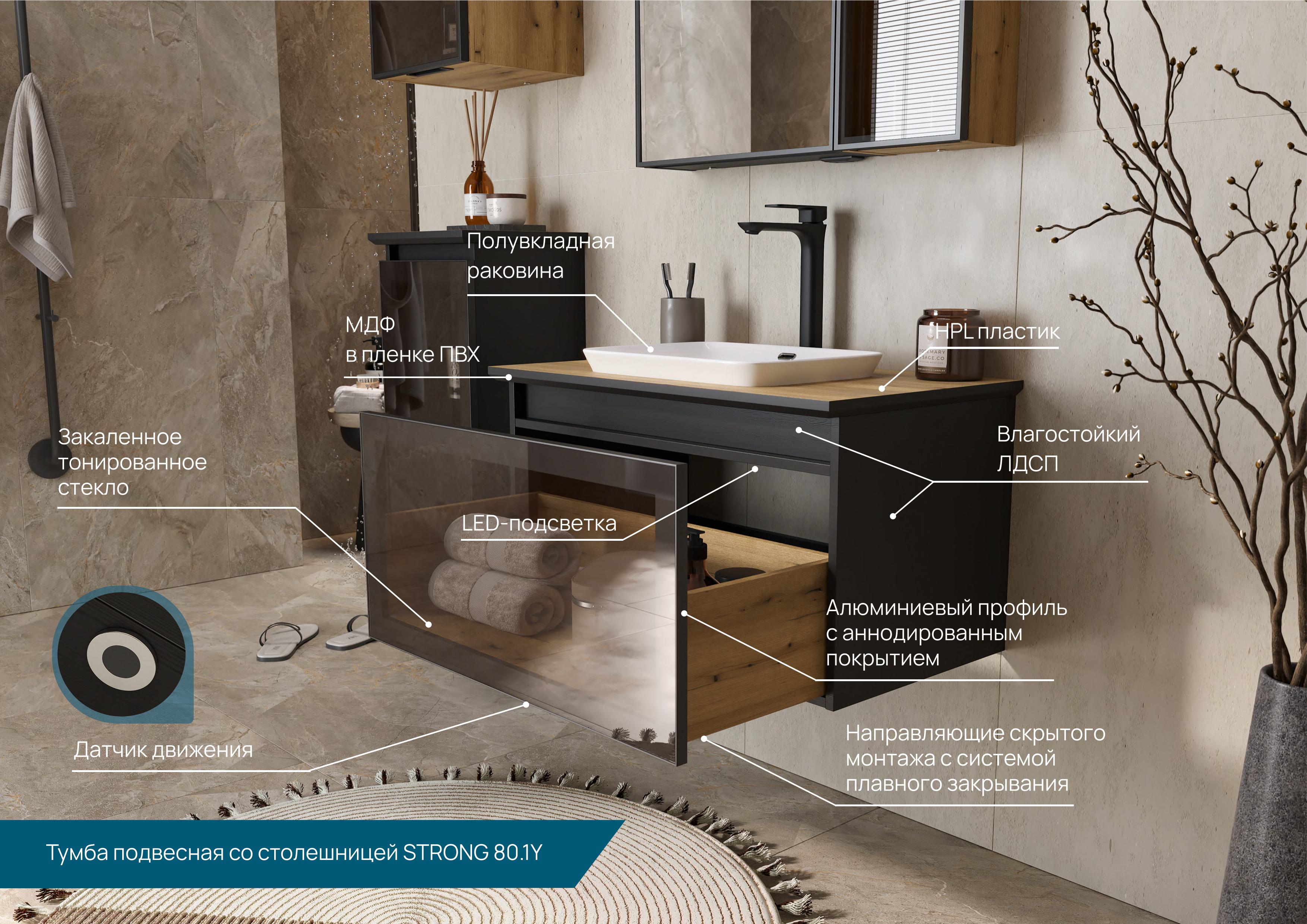 STRONG создаёт атмосферу современного санузла, где визуальная строгость сочетается с уютом. Эта коллекция подойдёт тем, кто ценит порядок, долговечность, минимализм и выразительные материалы. Здесь нет ничего лишнего - только чистая функциональность и уверенная эстетика, которая будет актуальна долгие годы.